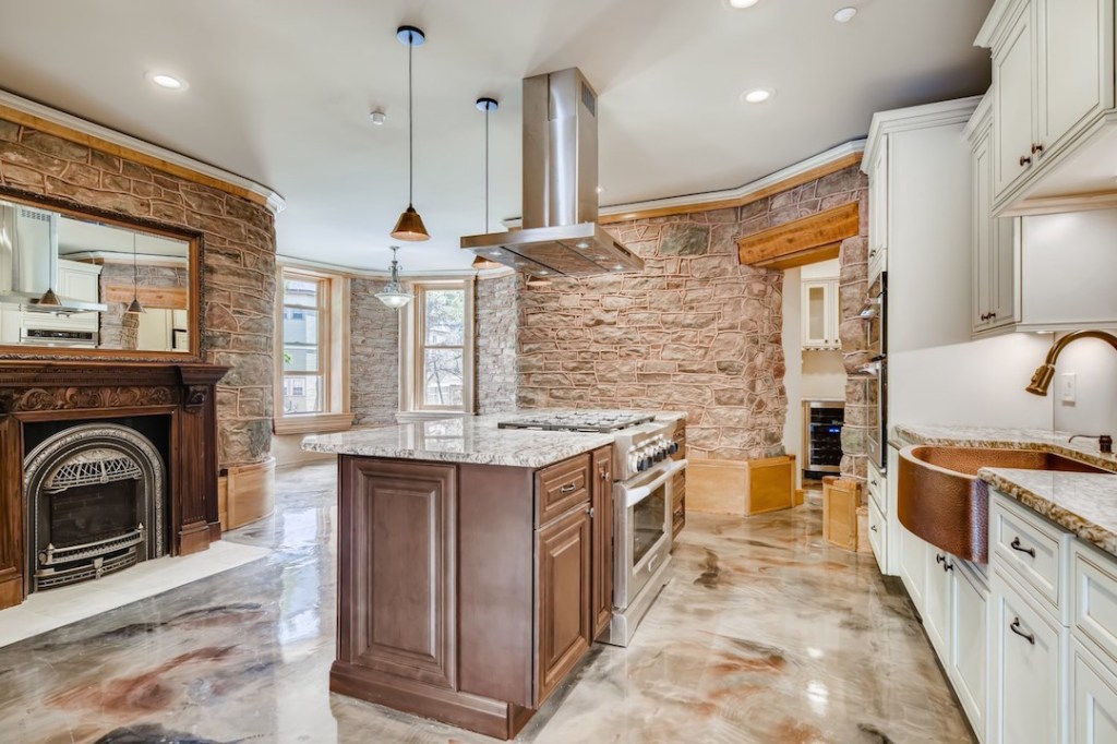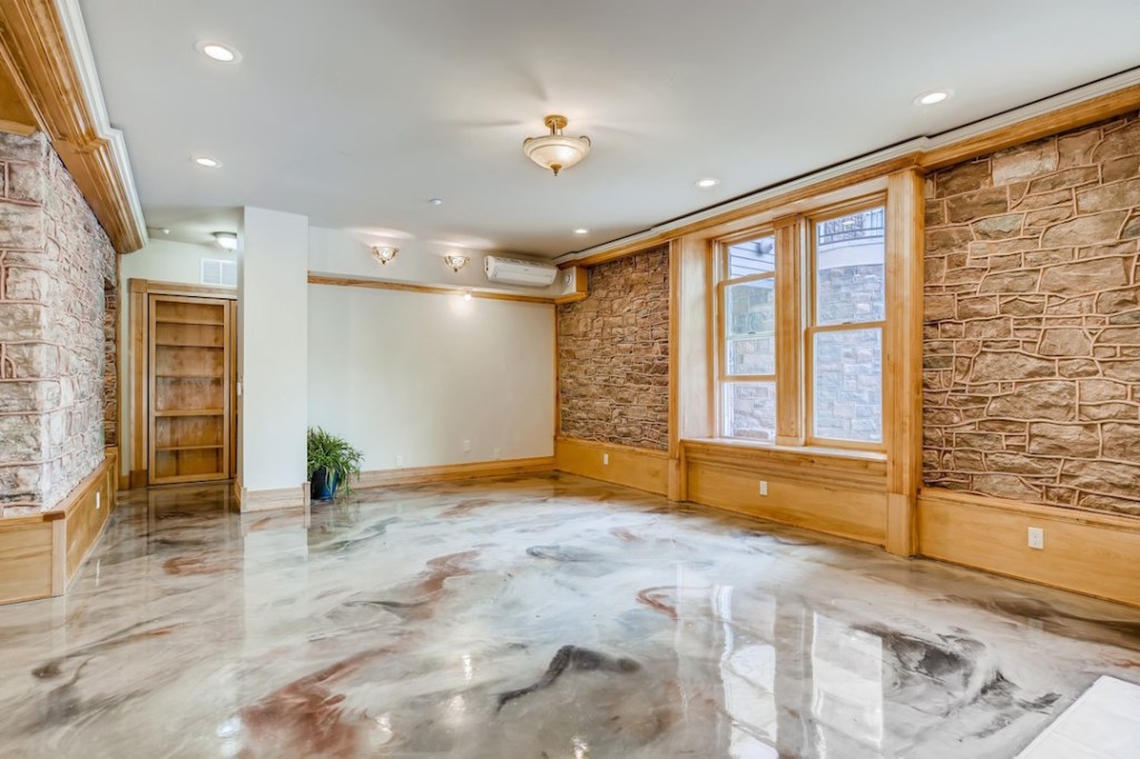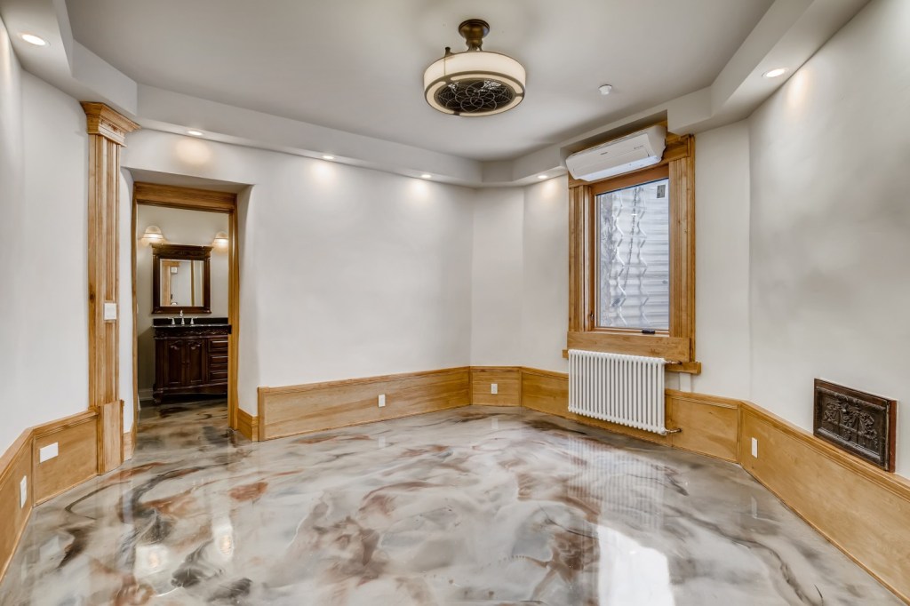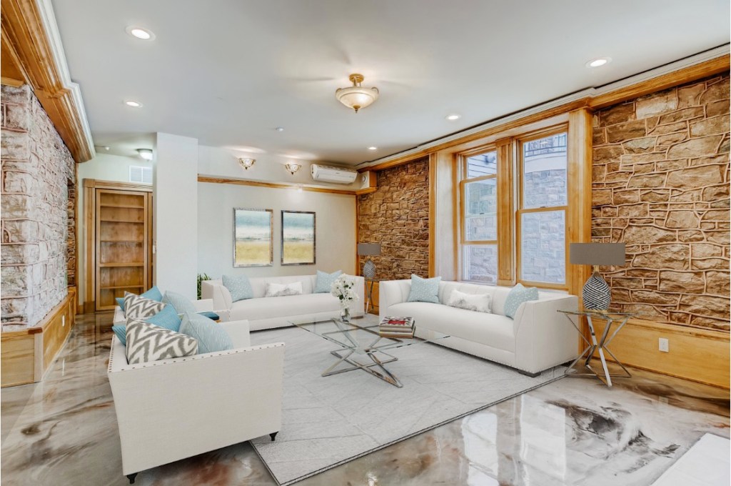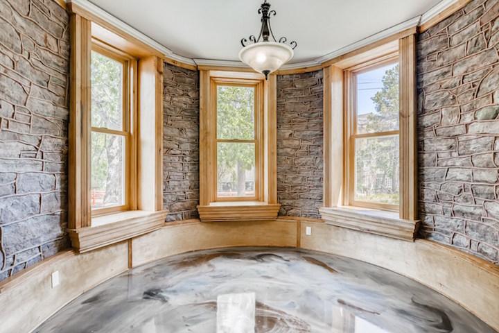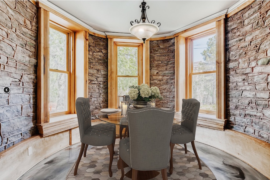The Garden Level Turret, a lovely spot for a dining area, continues the stone wall feature of this unit, along with carefully crafted art deco-style woodwork.