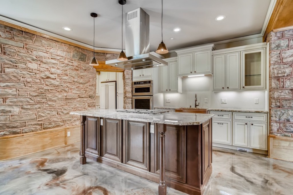 The gourmet kitchen features granite countertops, Kitchen Aid Pro SS Appliances, 6 burner gas stove with griddle and pot filler, Dual Microwave and Convention Wall Ovens, 36” Hammered Copper Farm Sink, Dishwasher, Instant Hot Water Dispenser, Slow Close, Solid Wood Cabinets and Granite Counters with Hammered Copper Pendant lighting.