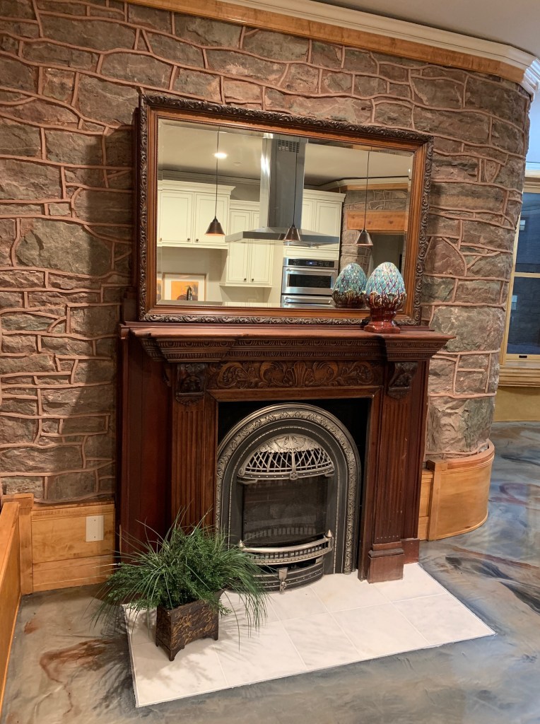 10′ stone walls with crown molding, oak trim/ baseboards, open floor plan, living room fireplace and wet bar.