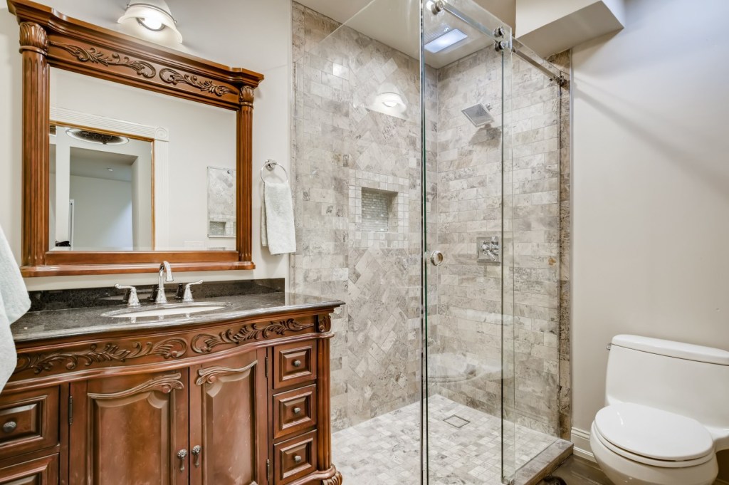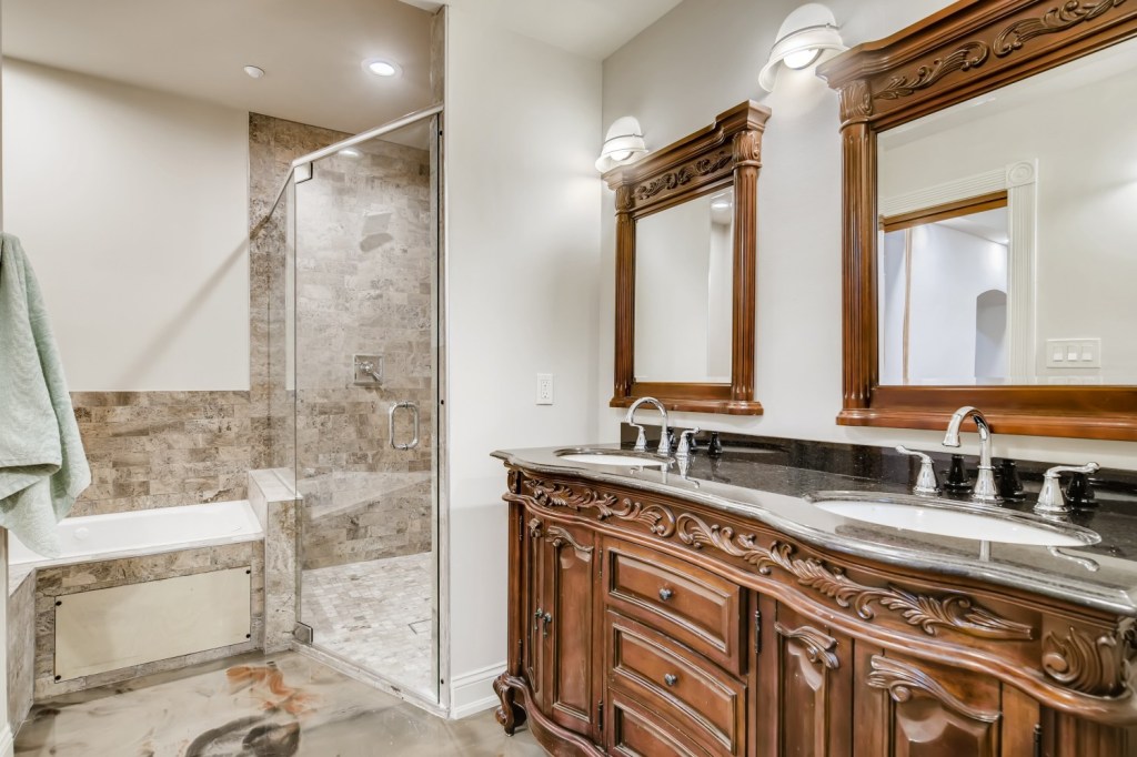 Master bedroom w 5 pc bathroom including jetted tub and walk-in closet. The Master Bath features Marble Shower Surround with Delta Fixture, Jetted Tub, Kohler Comfort Height Toilet, and beautifully detailed solid hardwood vanities with marble vanity tops and matching mirrors create keystone pieces.