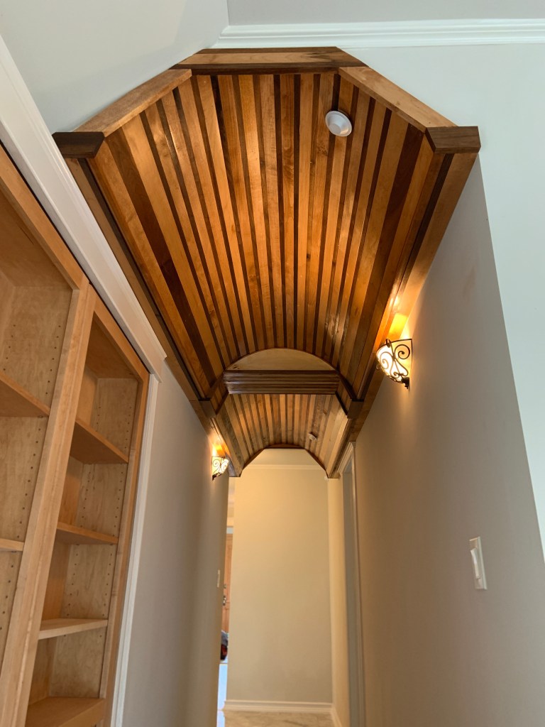 A carefully crafted barrel ceiling mixes both walnut and maple through the main hallway joining the two bedrooms and the main living space. At the left in the hallway stands the Invisidoor bookshelves that quietly house the laundry space.